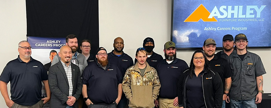 ECRU, Miss. – On January 4, Ashley Furniture Industries, LLC (Ashley) celebrated their recently launched Careers Program at the company’s Advanced Manufacturing facility in Ecru, MS. The program seeks to provide a structured career development path for high-potential Ashley employees into critical roles and place program participants into full-time positions upon graduation. The program partners with Itawamba Community College (ICC) aligning coursework with their Industrial Maintenance Program.